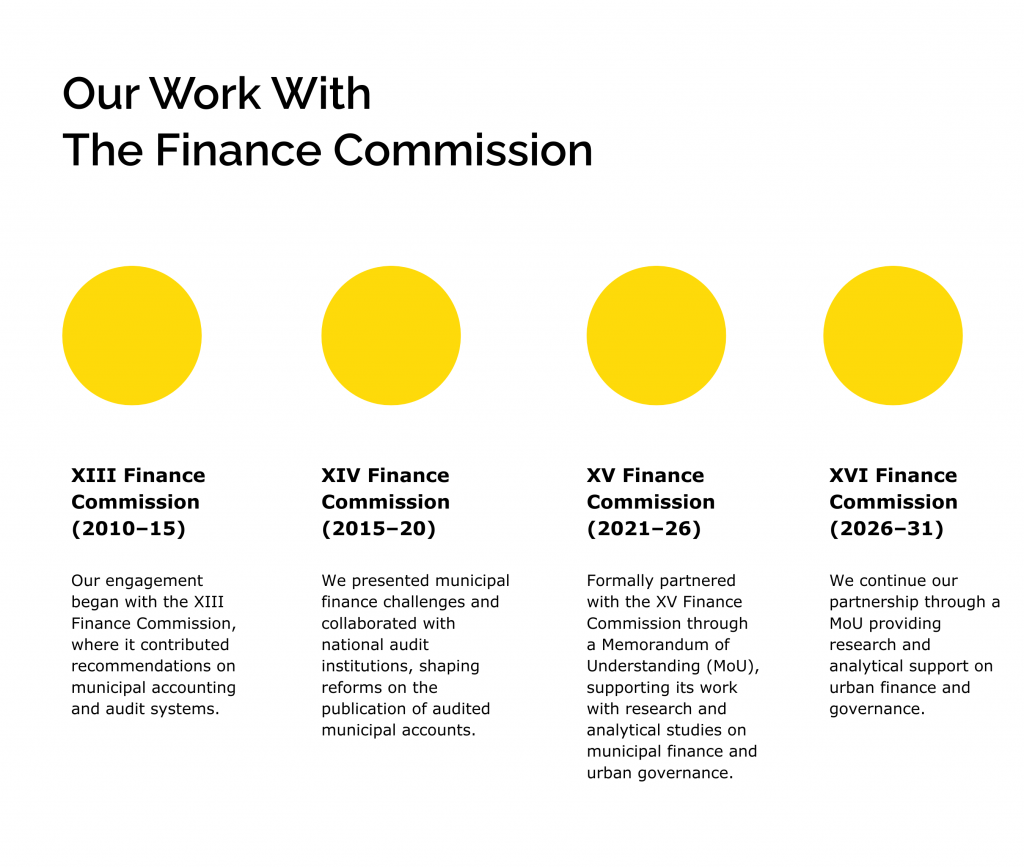 We formally engaged with the XV Finance Commission and continued with the XVI Finance Commission through Memoranda of Understanding, supporting the Commission’s work through research and analytical studies on municipal finance and urban governance.