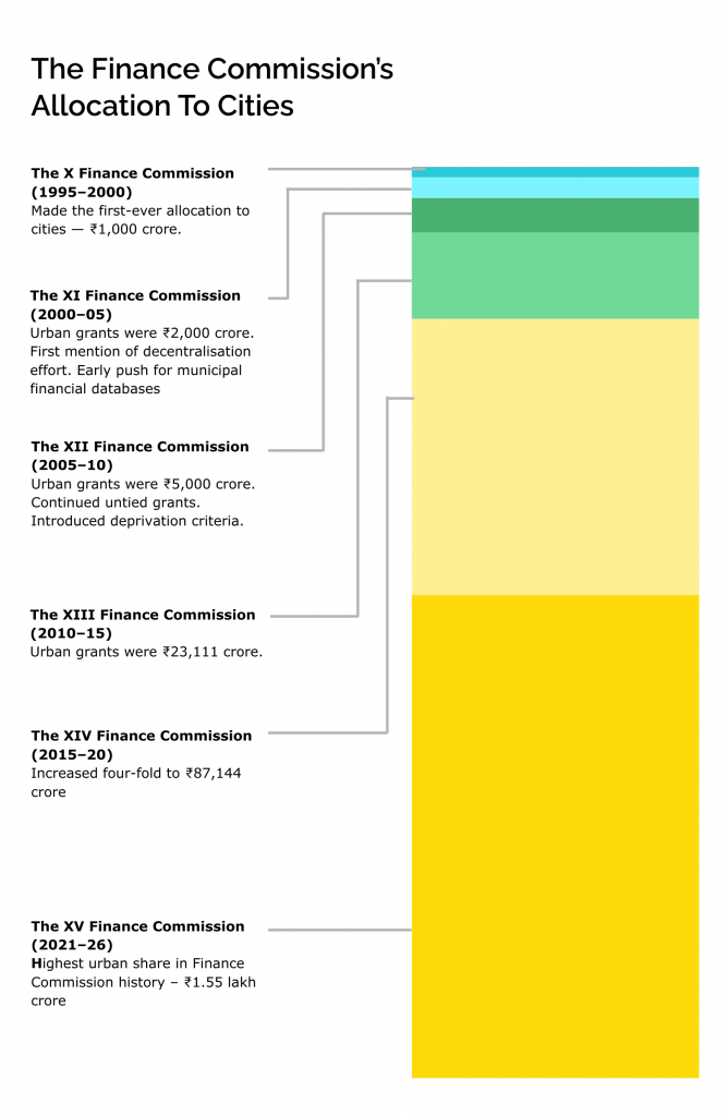 The last three decades have shown a profound shift in both scale and intent. The X Finance Commission (1995–2000) made the first-ever allocation to cities — ₹1,000 crore. This was a small, largely ad hoc transfer, routed through states, with no defined share of the divisible pool.